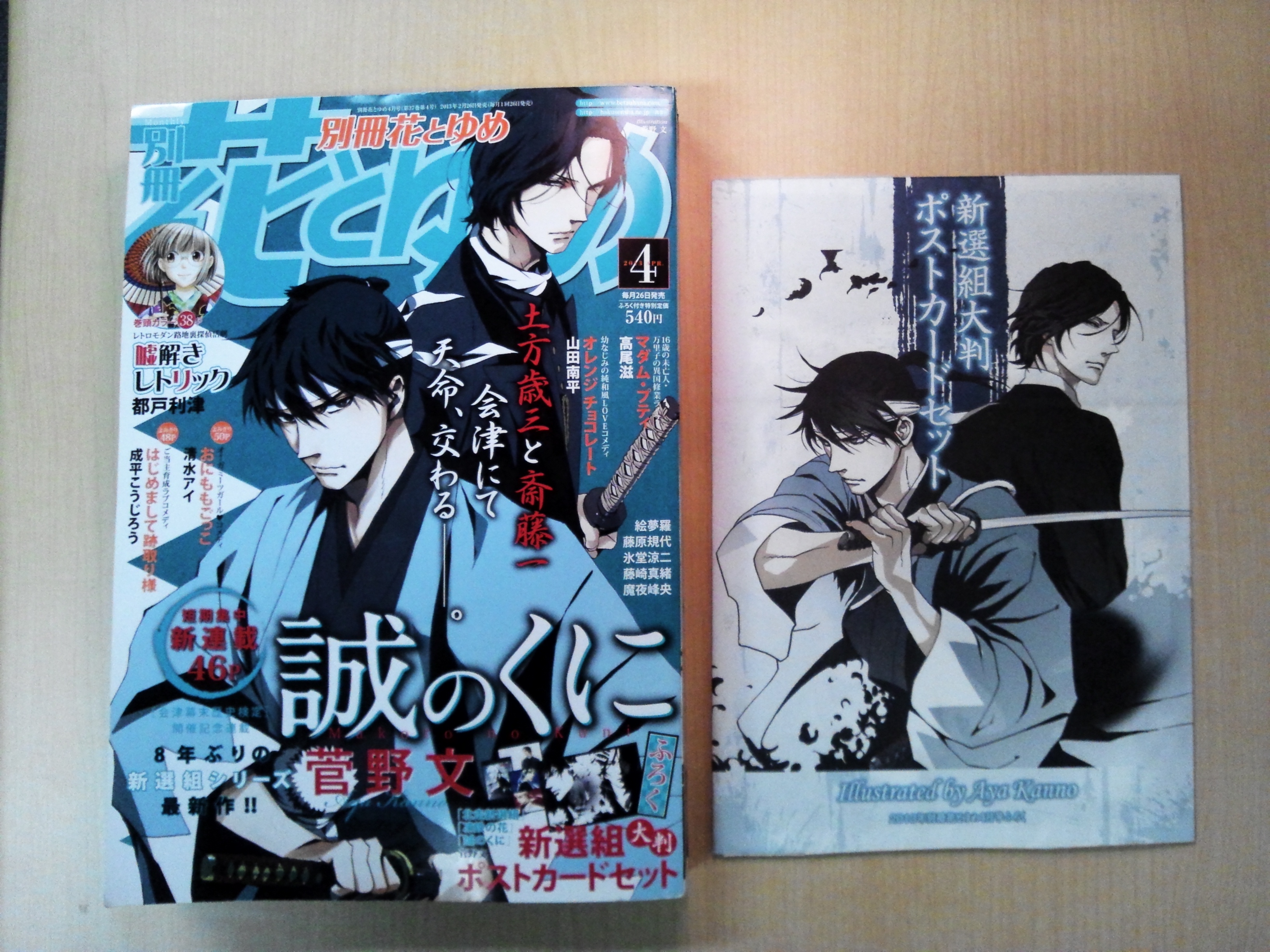 なるほど、今回は「新選組シリーズ」の新作で、土方と斎藤一ですか…。自分はプチ新選組オタなので(元調布市民だし)、とても楽しく読ませて頂きました。ふろくのポストカードセットも凄い綺麗です。というかこれ、絵にメッチャ気合い入ってます。袋とじ企画なのでアップは控えますが、気になる方は是非購入して見て下さい(笑)!